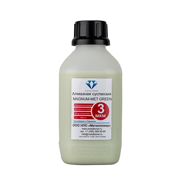 МAGNUM-MET GREEN – Монокристаллическая алмазная суспензия на спиртовой основе применяется для полировки материалов чувствительных к воде. Если после этапа финишного полирования образовались грязные пятна мешающие увидеть неметаллические включения на образце, суспензия на спирту то что вам нужно в этом случае.
