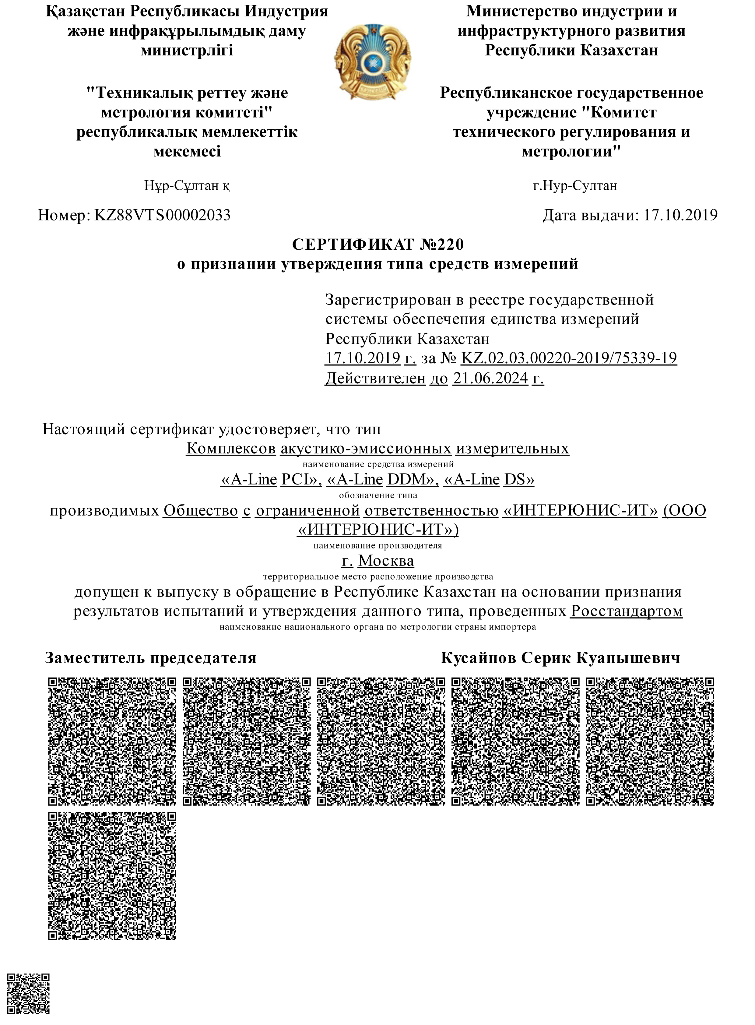 На основании Сертификата № 220 от 17 октября 2019 года о признании утверждения типа средств измерений комплексы акустико-эмиссионные измерительные "A-Line PCI" допущены к выпуску в обращение в Республике Казахстан.
