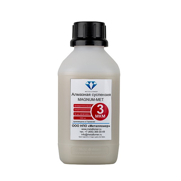 MAGNUM-MET - Концентрированная монокристаллическая алмазная суспензия на водной основе для агрессивного съема материала с поверхности образца. Не содержит охлаждающий лубрикант и обладает плотным распределением алмазных частиц. В целом повторяет свойства суспензии MAGNUM-MET DUO.
